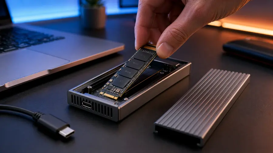 Imagine que você gravou um vlog em 4K e precisa editar no seu notebook, mas o armazenamento interno está cheio. Com um SSD Externo DIY conectado via USB-C, você pode editar os arquivos diretamente do drive externo no Adobe Premiere ou DaVinci Resolve sem engasgos (lags), como se o arquivo estivesse dentro do computador.