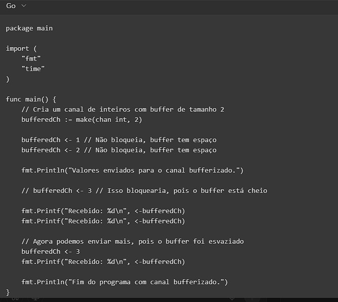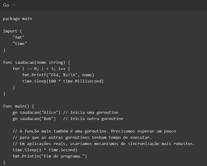 Aqui, saudacao(“Alice”) e saudacao(“Bob”) rodam como goroutines distintas, com suas saudações se intercalando. A main goroutine aguarda (time.Sleep) para que as outras concluam, evitando que o programa termine prematuramente.