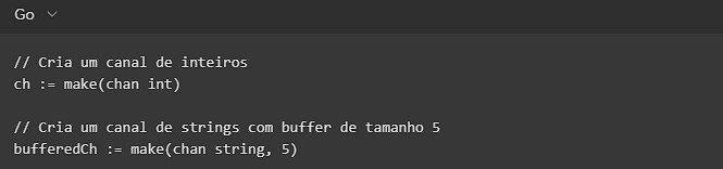 Para a comunicação entre goroutines, utilizamos canais. Canais são tipados e servem como um meio seguro para goroutines trocarem informações e se sincronizarem. A filosofia “Não se comunique compartilhando memória; compartilhe memória comunicando-se” é central, prevenindo problemas comuns de concorrência como condições de corrida e deadlocks.