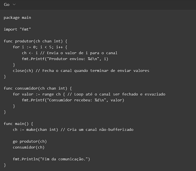 Neste exemplo, produtor envia números para ch, e consumidor os recebe. close(ch) sinaliza o fim dos valores, permitindo que o for range do consumidor termine. Canais não-bufferizados sincronizam envio e recebimento: o remetente bloqueia até o receptor estar pronto, e vice-versa.