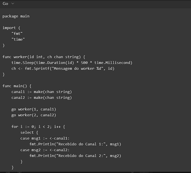 Aqui, main aguarda mensagens de canal1 ou canal2. Embora worker(1) tenha um Sleep menor, o select assegura que o programa reaja à primeira mensagem disponível, independentemente do canal.