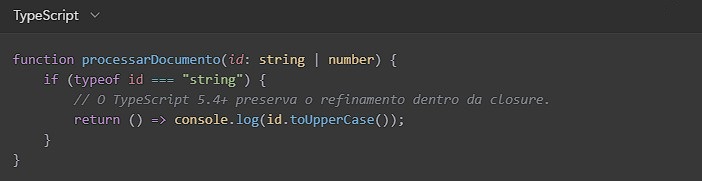Historicamente, o TypeScript perdia a referência de refinamento de tipo (narrowing) quando uma variável era utilizada dentro de uma função interna ou closure. A partir da versão 5.4, o compilador passou a rastrear essas referências de forma mais eficaz, permitindo que o refinamento seja preservado mesmo em contextos assíncronos ou funções de retorno.