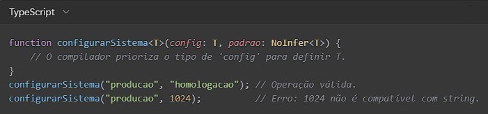 Em funções genéricas complexas, o compilador por vezes infere tipos excessivamente abrangentes, o que pode comprometer a segurança da aplicação. O utilitário NoInfer, introduzido na versão 5.4, permite que o desenvolvedor especifique quais argumentos não devem contribuir para a inferência de um parâmetro de tipo genérico, garantindo um controle mais granular sobre a tipagem.